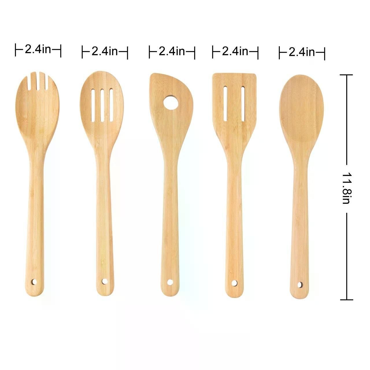 Bamboo Kitchen Tool Set 5 Pieces Utensils are made of bamboo. It has a beautiful natural color and is very environmentally friendly. But please note that it can only be washed by hand and is not suitable for machine washing, and please stay away from open flames when cooking. The size of these five different kinds of tools is 11.8*2.4in and they can be used for stir-frying, serving, filtering, and mashing food. This ensures that you're cooking conveniently. They are very helpful and multifunctional, as well as stand up to the demands of everyday cooking in the home.