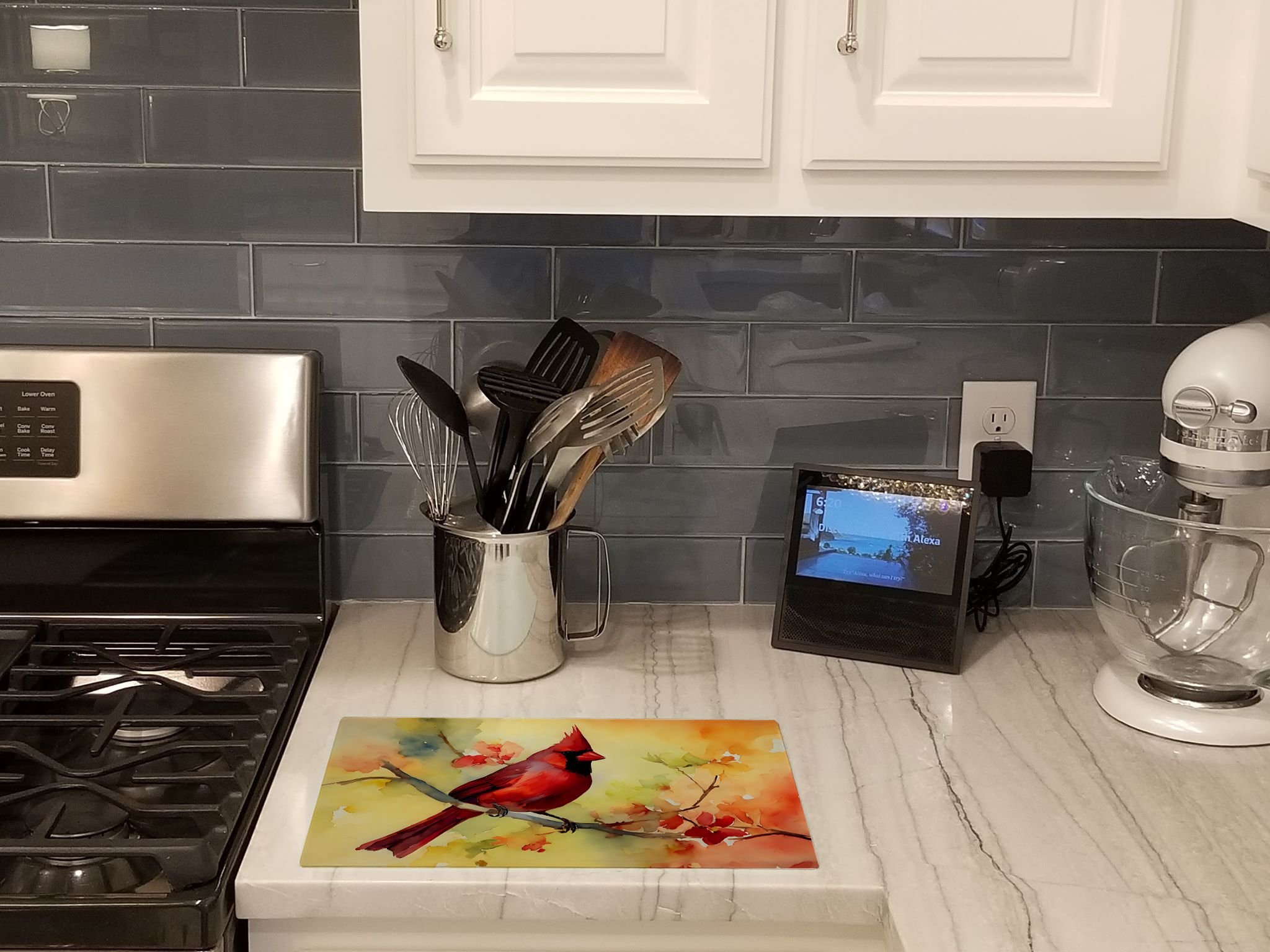 Glass Cutting Board featuring breed specific Cardinal artwork. Introduce your kitchen to the vibrant, large Decorative Glass Cutting Board from Caroline's Treasures. Crafted from resilient tempered glass, this board is not only a utilitarian necessity but also a colorful art piece. With its generous dimensions of 15 inches in height and 12 inches in length, it offers ample space for all your cutting needs. Every piece showcases captivating artwork from distinguished artists, bringing an aesthetic edge to your kitchen. Beyond its attractive design, this cutting board ensures your countertop stays pristine and unscathed, owing to its heat-resistant properties. Engineered with user convenience in mind, it features non-skid feet for stability, and rounded corners for additional safety. Its robust construction renders it virtually unbreakable, guaranteeing longevity. The board comes with protective feet bumpers, maintaining its position during use. This product is recommended to be hand washed only. Proudly printed and assembled in the United States, this cutting board exemplifies superior craftsmanship. With Caroline's Treasures' Decorative Glass Cutting Board, you're investing in a blend of functionality and artistic flair.