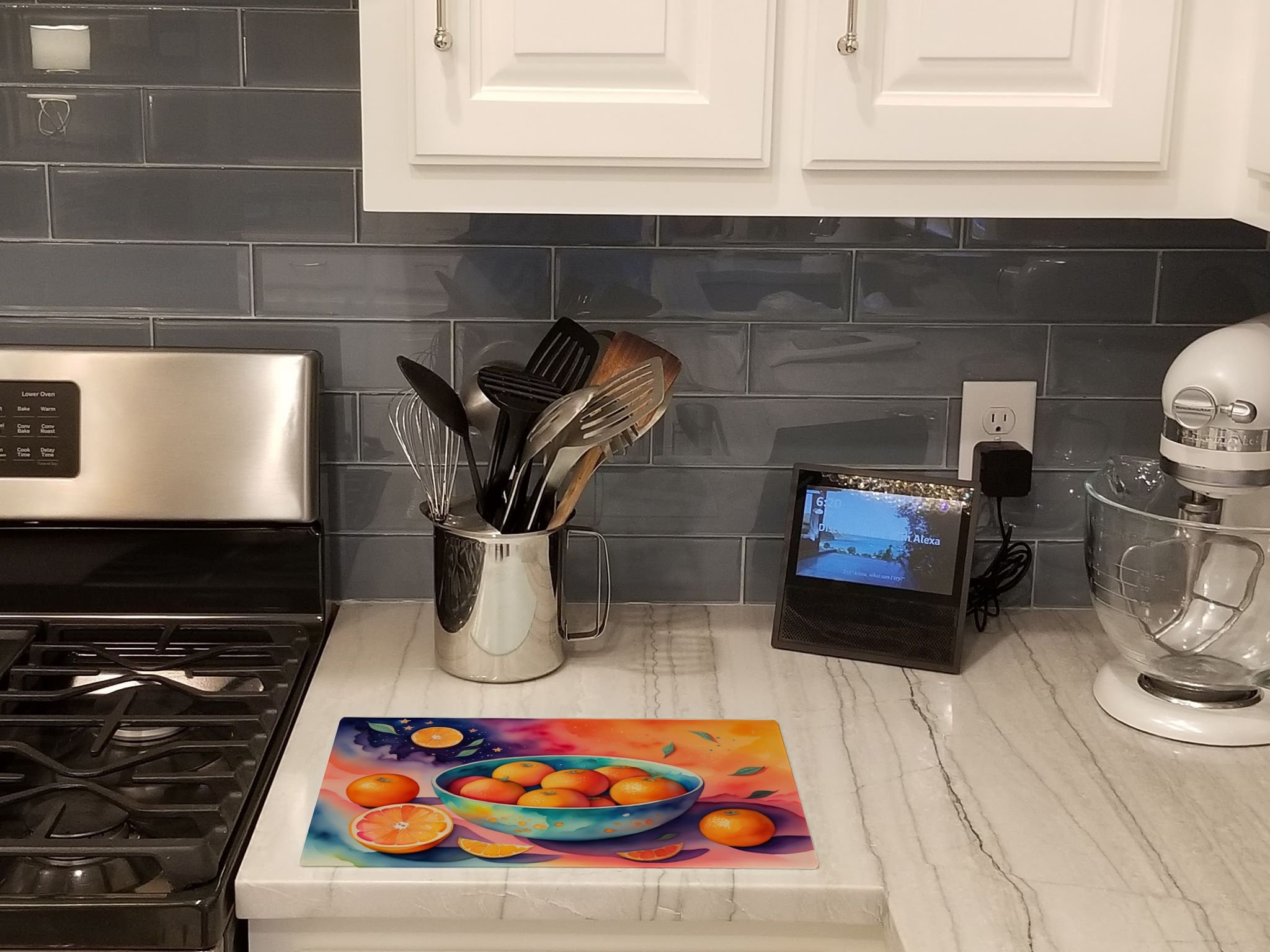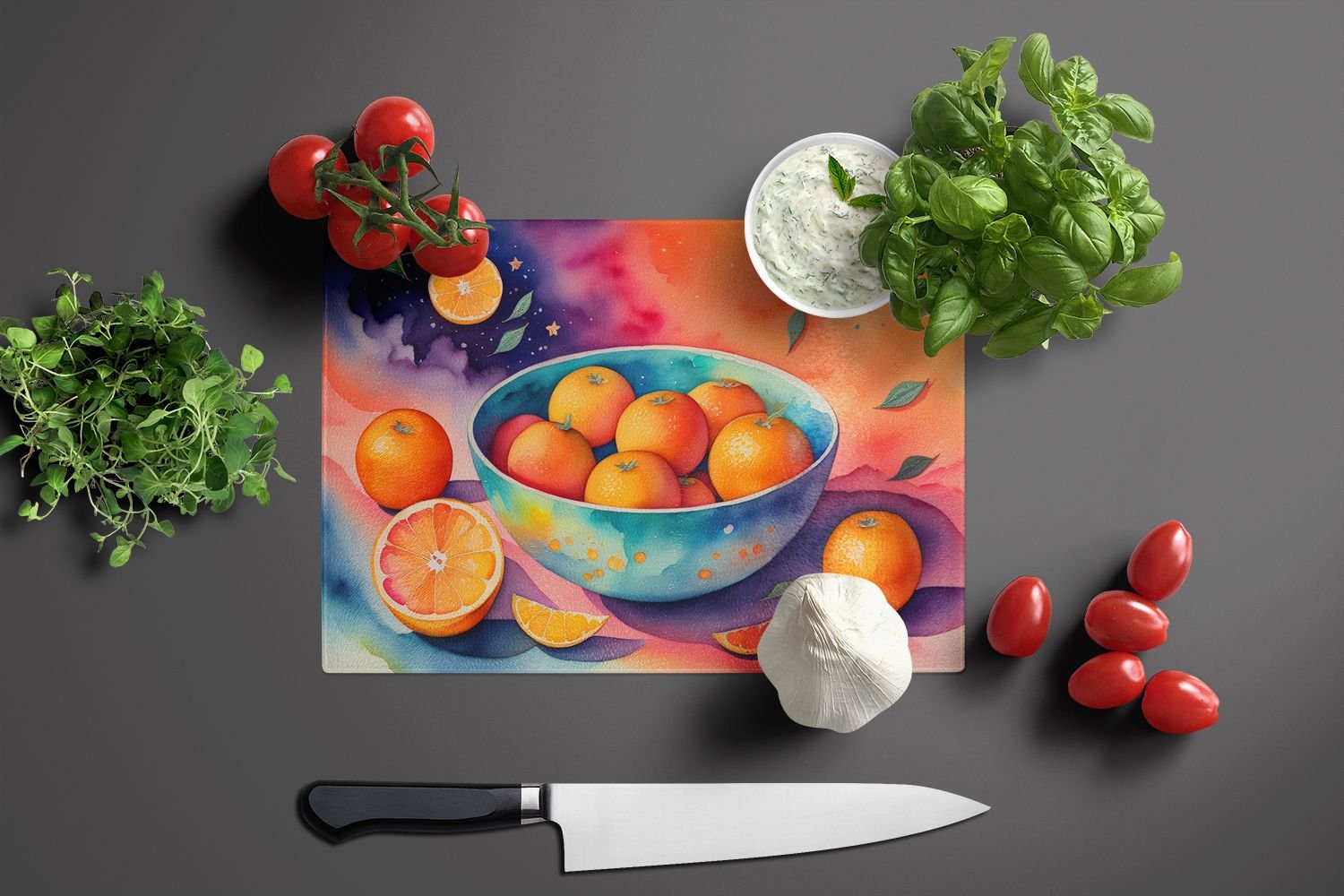 Glass Cutting Board featuring breed specific Oranges artwork. Introduce your kitchen to the vibrant, large Decorative Glass Cutting Board from Caroline's Treasures. Crafted from resilient tempered glass, this board is not only a utilitarian necessity but also a colorful art piece. With its generous dimensions of 15 inches in height and 12 inches in length, it offers ample space for all your cutting needs. Every piece showcases captivating artwork from distinguished artists, bringing an aesthetic edge to your kitchen. Beyond its attractive design, this cutting board ensures your countertop stays pristine and unscathed, owing to its heat-resistant properties. Engineered with user convenience in mind, it features non-skid feet for stability, and rounded corners for additional safety. Its robust construction renders it virtually unbreakable, guaranteeing longevity. The board comes with protective feet bumpers, maintaining its position during use. This product is recommended to be hand washed only. Proudly printed and assembled in the United States, this cutting board exemplifies superior craftsmanship. With Caroline's Treasures' Decorative Glass Cutting Board, you're investing in a blend of functionality and artistic flair.